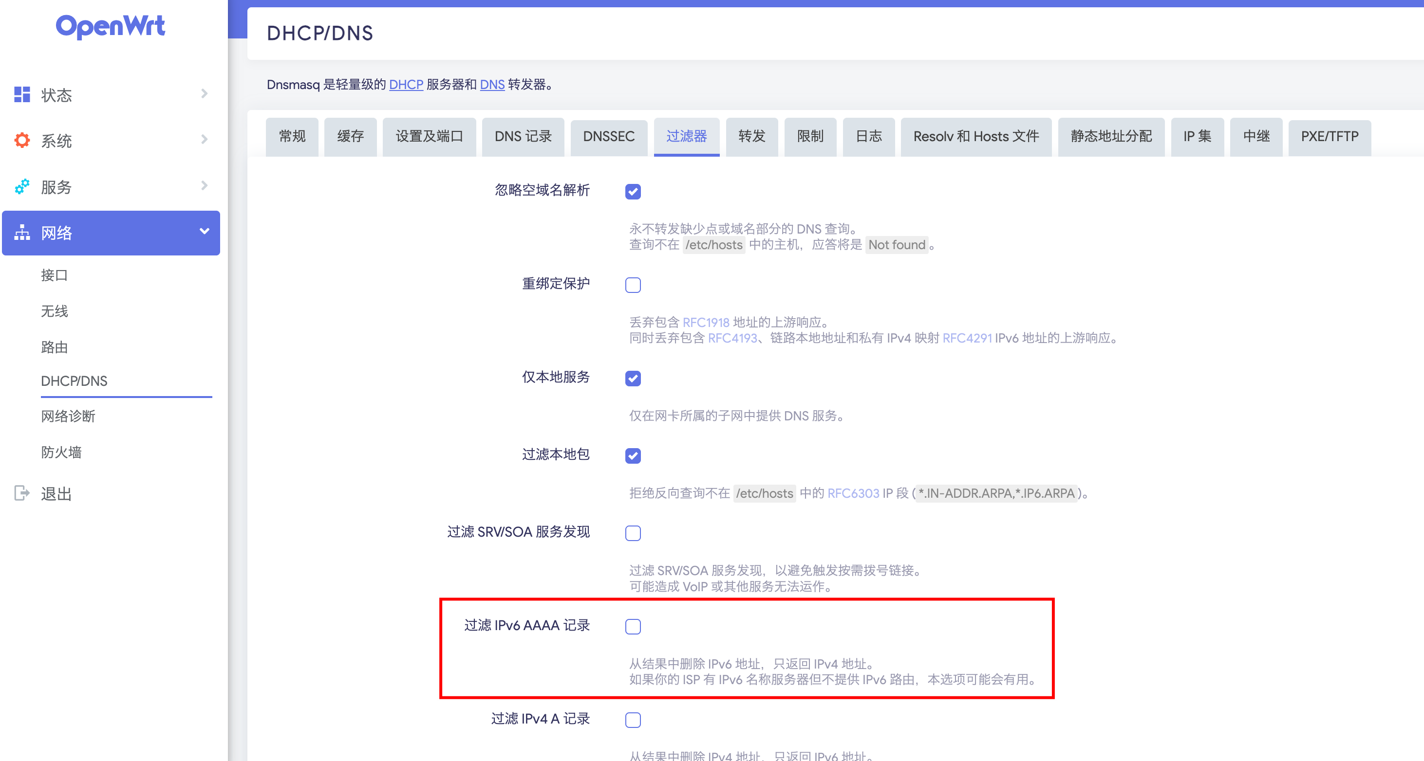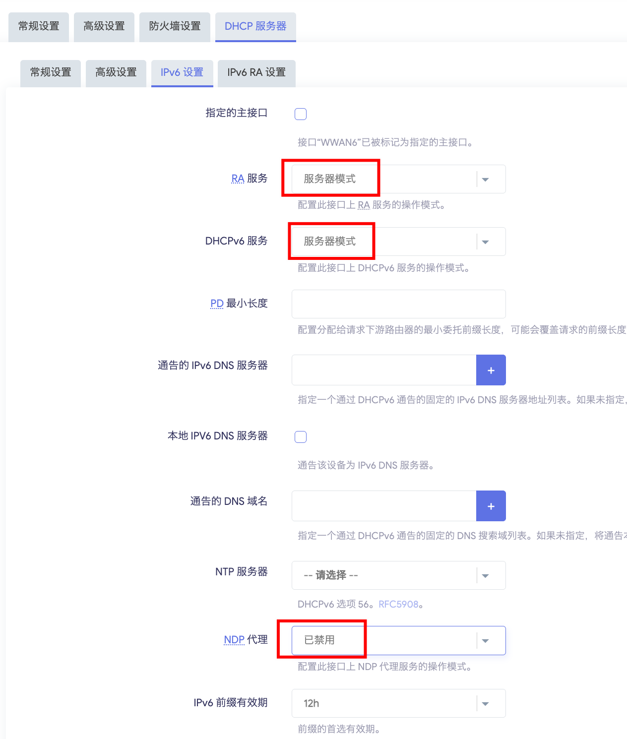 网络 - 接口 - lan - DHCP 服务器 - IPv6 设置