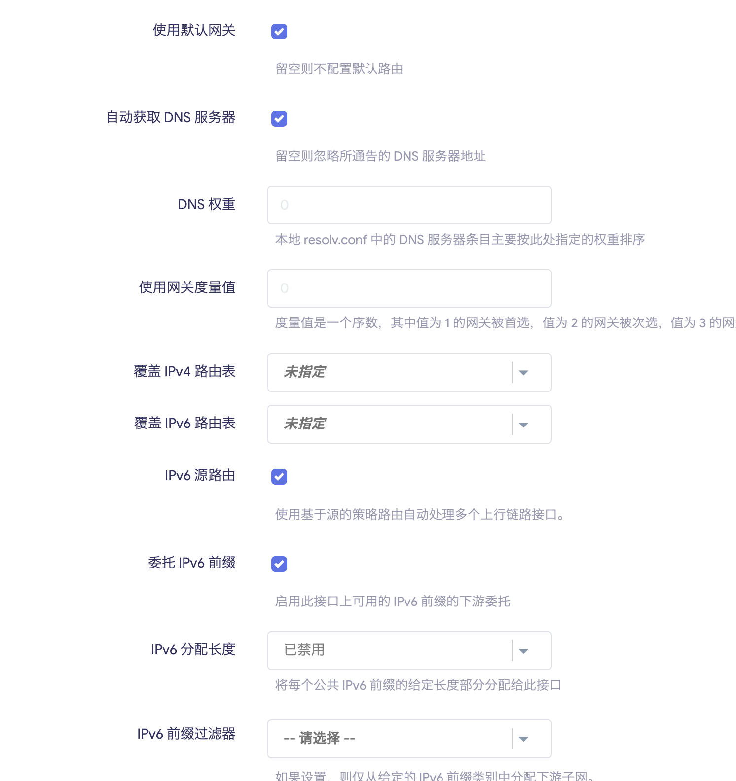 如果运营商无法通过 PD 下发 IPv6 地址,请参考 校园网 & 远程访问(IPv6) 伪装 PD 的配置部分,一般而言都配置为中继模式
