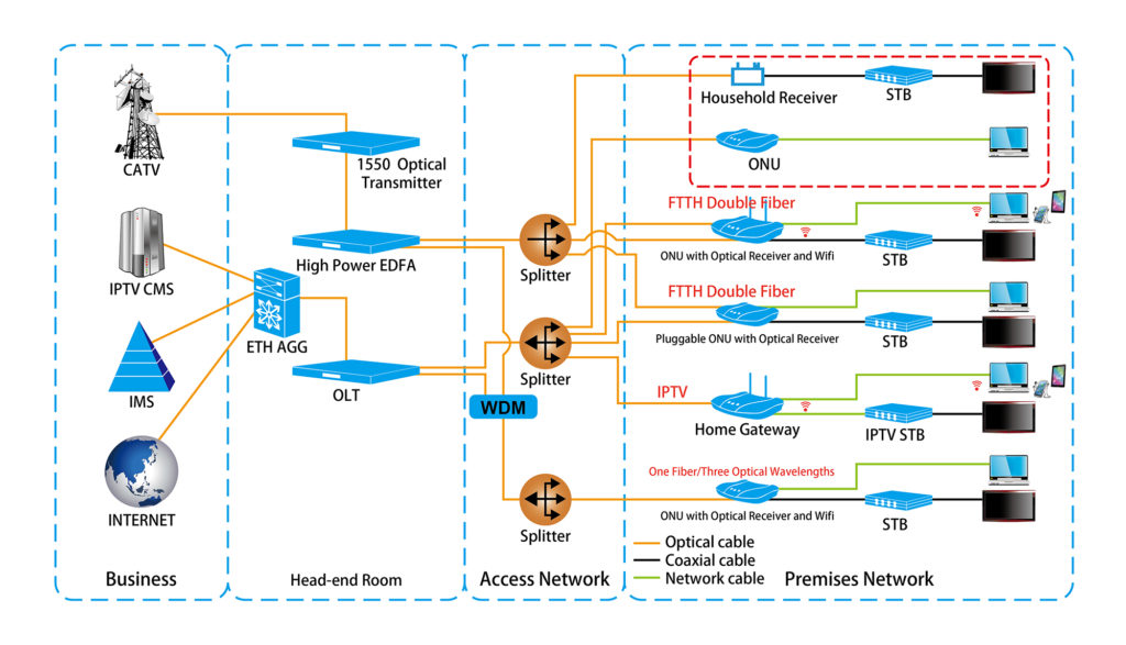 - FTTH(Fiber to the Home):ONU 放置在家庭用户中