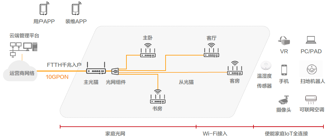 和我们之前介绍的 FTTx 网络不同,光纤通往用户的终点并不是 ONU。对于 FTTR 方案而言,ONU 仍然是用户的主光猫,光纤从光猫通往的各房间设备,只是子路由,在网络中只起到桥接作用,路由器行使的路由、DHCP、防火墙等功能仍然是由主光猫完成的,而各个房间里的从设备统一受到主光猫的管理,类似我们提到的 AP 或者 EasyMesh 中的 Agent 设备。