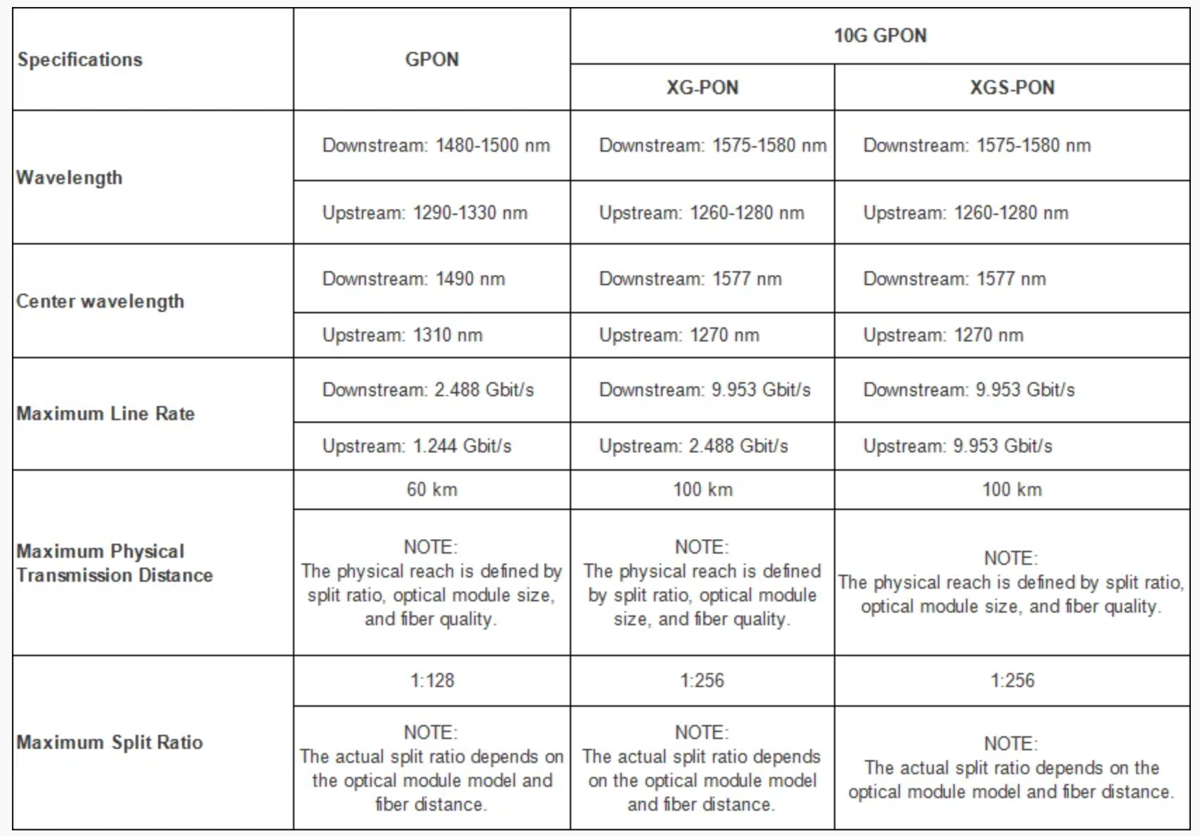 其中,GPON 的上行速率为 2.5Gbit/s,下行速率为 1.25Gbit/s;XG-PON 的上行速率为 10Gbit/s,下行速率为 2.5Gbit/s;XGS-PON 的上行速率为 10Gbit/s,下行速率为 10Gbit/s。