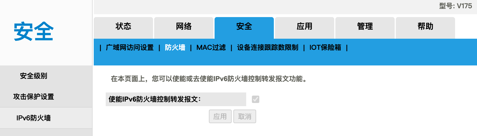 - 关闭光猫的 IPv6 防火墙。关闭后,网络中所有获取到公网 IPv6 地址的设备都暴露在公网中,请务必在设备端配置好防火墙设置。